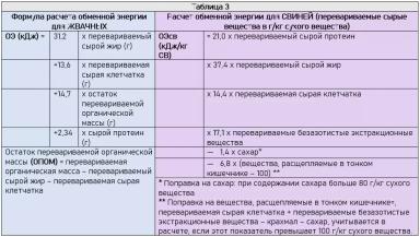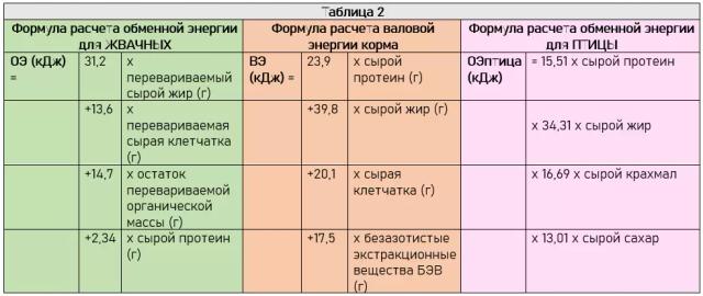 Расчет обменной энергии корма для птицы в большинстве стран осуществляется по формуле, опубликованной World`s Poultry Science Association. В расчете не учитывается сырая клетчатка, поскольку обычно птица получает корма высокоперевариваемые и содержащие малое количество клетчатки - Таблица 2