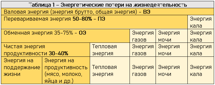 Основой любой системы энергетической оценки корма является знание всех энергетических потерь при превращении энергии корма в энергию на поддержание жизни и продуктивность - Таблица 1