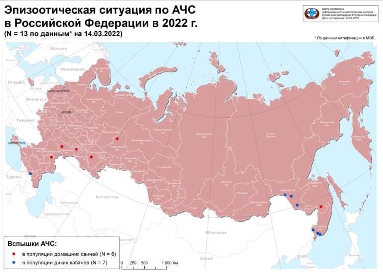 По данным Россельхознадзора, на территории РФ за 2022 год, на 14.03.2022, количество случаев заболевания АЧС домашних свиней – 6; диких кабанов – 7.