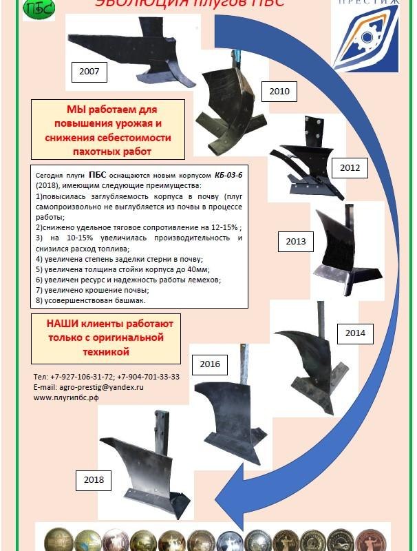 В 2012г разработан корпус плуга ПБС с перьевым отвалом и долотом, затем корпус претерпевал изменения и с 2018 года начато производство рабочего органа комбинированного типа КБ-03-6. С такими корпусами сегодня производится серия навесных и прицепных плугов ПБС группой компаний Престиж (Саратов-Энгельс). Подробная информация размещена на нашем сайте и в Instagram @plugipbs.