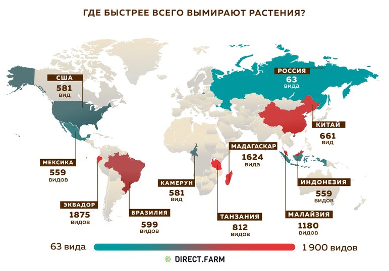 Россия в этом списке на 62-м месте. На её территории к концу 2019 года зарегистрировано 63 вида исчезающих растений. Возглавляет Красный список Эквадор, за ним следуют Мадагаскар, Малайзия, Танзания и Китай. Топ-10 завершают Бразилия, Камерун, Мексика, США и Индонезия.