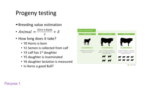 Изначально, когда рождается корова, у неё ещё нет геномной оценки племенной ценности. Можно взять примерную оценку от родителей, но не все животные от одних и тех же родителей будут одинаковыми. Можно сделать менделевскую выборку, а не только полагаться на прогнозируемую племенную ценность. Например, бык осеменил корову, и у нас есть три-четыре телёнка. Можно посмотреть на четырехгодовой период развития — первая лактация, беременность и так далее. Через четыре-шесть лет мы сможем примерно сказать, хороший ли это бык или нет. Точность этой оценки высокая, но этот процесс занимает много времени. Большая проблема для нас — низкая скорость процесса оценки и переоценки производителей.