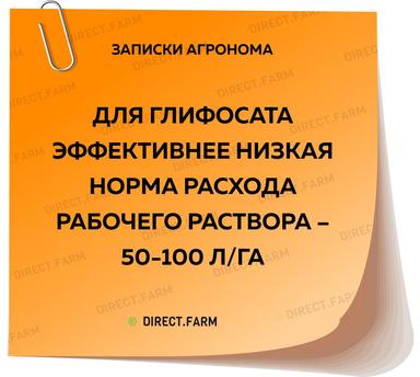 - Для глифосата низкая норма расхода рабочего раствора будет лучше, т.к. действующее вещество системного действия и проникает в растение за счёт разности концентраций. Агрономы отмечают наиболее результативный расход 50-100 л/га. Но с минимальной нормой (50 л/га) рекомендуют работать только весной на молодых сорняках.