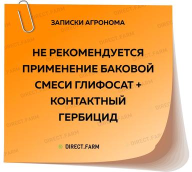 - Не рекомендуется применение в баковой смеси глифосат + контактный гербицид, так как второй может помешать системному действию глифосата посредством подсушивания поверхности растения и, следовательно, снижению проникновения первого в растение.