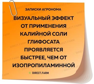 - Калийная соль глифосата (540 г/л) – по опыту агрономов, характеризуется более быстрым эффектом действия на сорные растения, в отличие от изопропиламинной соли глифосата (360 г/л). Калийную соль эффективно применять перед посевом.