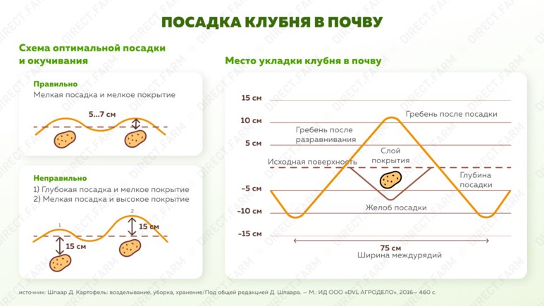 🟠 Более глубокая посадка отрицательно влияет на урожайность и повышает потери при копке. Кроме того, усложняется работа выжимного лемеха и снижается производительность уборочной техники, повышается опасность механических повреждений клубней.