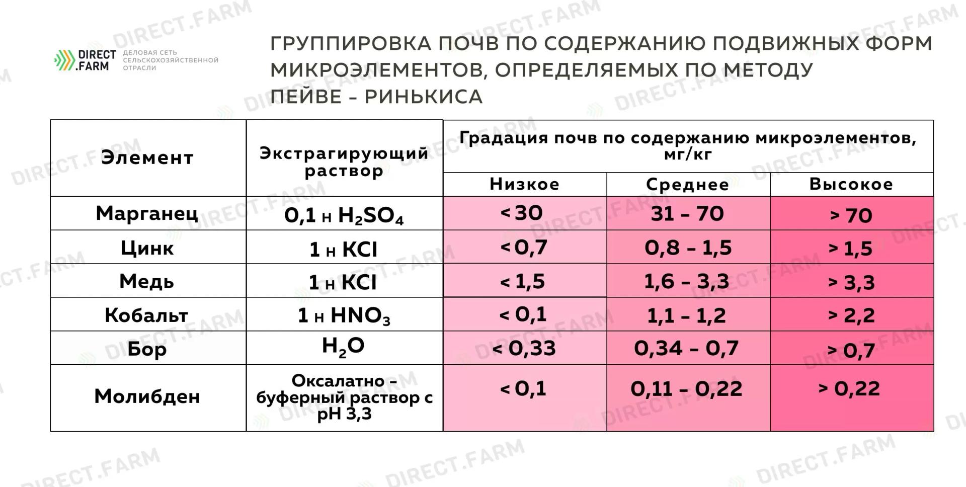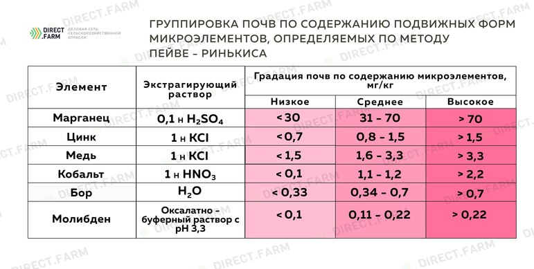 Ниже представлена градация почв, позволяющая определить уровень наличия в почве тех или иных микроэлементов.