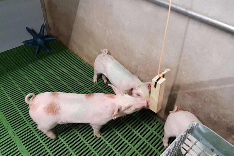 Главный момент заключается в том, что свиньям понравится почти все новое. Поэтому зачастую разнообразие даже важнее, чем материал игрушек. Обогащение среды широко применяют против каннибализма, особенно обгрызания хвостов, и в таких группах животным рекомендуется предлагать новые предметы раз в 2-3 дня. Совершенно необязательно закупать массу специальных товаров. К примеру, предложите простую картонную коробку, которую свиньи могут разорвать на части. Предварительно убедитесь, что предмет безопасен (уберите все пластиковые или острые элементы), не представляет угрозы с точки зрения биобезопасности и пригоден для использования группой животных. Материал предлагаемых игрушек можно чередовать раз в неделю или в несколько недель. Не стоит покупать дорогие игрушки, которые быстро приходят в негодность. Подумайте об использовании доступных предметов, подходящих для свиней и вызывающих у них интерес.