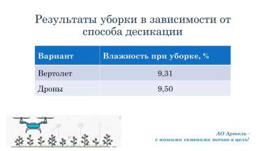 После уборки мы выбрали влажность подсолнечника после обработки вертолетом, и после обработки дронами. В связи с тем, что убирали разные поля, различия во влажности можно считать погрешностью опыта.