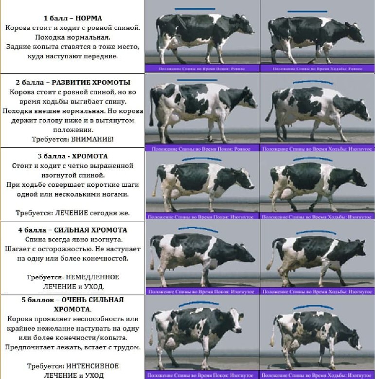 Обычно считается, что 2 и 3 балла представляют коров с субклинической хромотой, у которых выявленные проблемы следует лечить. 4 и 5 баллов соответствуют коровам с клинической хромотой, серьезными трудностями при ходьбе и сильными болями. Эта система оценки не указывает, почему нарушена походка коровы, не устанавливает диагноз, а просто показывает, что у животного есть некоторая степень аномалии походки. Имейте в виду, что плохая оценка движения не всегда может быть связана с проблемами с копытами или ногами, а также может указывать на такие состояния, как ацидоз, заболевания суставов, смещение сычуга и многие другие заболевания.