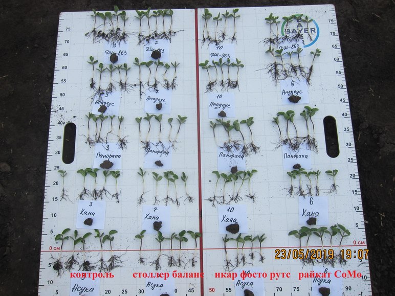 Сорта: Асука, Панорама, Амадеус, Хана, ДШ 863. Норма высева 700 тыс. Все семена были также протравлены Максим XL. На сортах Амадеус и Хана стимулятор был нанесен одновременно с фунгицидом, а следующим слоем наносился инокулянт (Хайкоут). На сортах Панорама, ДШ 863 и Асука очередность нанесения препаратов была такая: сначала Максим XL, потом инокулянт (Оптимайз 400), затем испытуемый препарат. Схема см таблицу 3.
