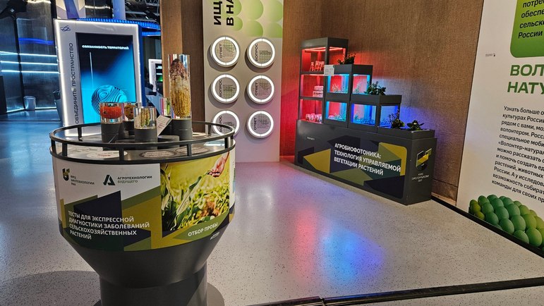 Объект под название «Агробиофотоника: технология управляемой вегетации растений» демонстрирует сити-ферму. Экспонат состоит из живых растений, которые представлены в разный период их роста – от ростков в пробирках до цветения. Уникальной особенностью опытно-промышленной полностью автоматизированной вертикальной фермы является индивидуально настраиваемое LED-освещение с разным спектральным составом.
