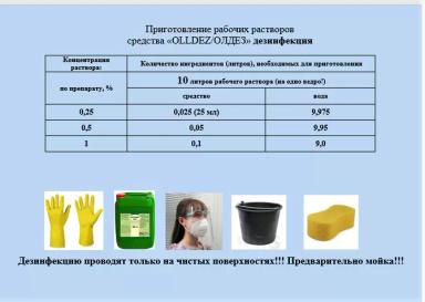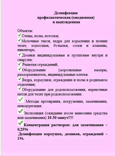 2. Дезинфекция должна происходить под курированием и наблюдение главного ветеринарного врача либо ветеринарного фельдшера. Во время проведения дезинфекции обязательно строгое соблюдение правил техники безопасности и обращения с используемым средством.