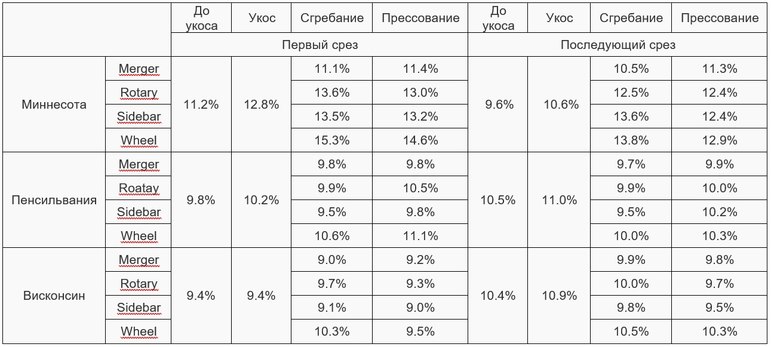 Таблица 1. Зольность люцерны перед укосом, после укоса, после сгребания и после прессования люцерны после первого и последующего укоса в Миннесоте, Пенсильвании и Висконсине в 2019 г. Сено сгребалось с помощью Мерджер, роторных граблей, пальцевых граблей с боковой укладкой или колесно-пальцевых граблей.