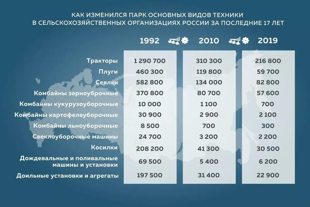 Мы решили сравнить техническую оснащенность сельскохозяйственных организаций в России (не учитывая хозяйства населения, КФХ и ИП), взяв данные 1992 и 2010 годов и сопоставив их с показателями 2019 года. Все цифры приведены на конец указанного в столбце года.