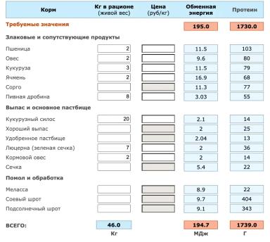 Оптимизация кормления, составление рационов, кормосмесей, комбикормов, белково-витаминно-минеральных комплексов в идеале должна быть с учётом питательной ценности и химического состава сырья. Но это не доступно небольшим и фермерским хозяйствам, для них есть простые калькуляторы для КРС (файл 2, белорусские коллеги показали).