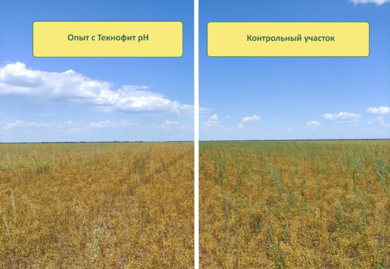 На фотографиях вы можете видеть результат опыта в Волгоградской области в одном из хозяйств Чернышковского района. Сравнение эффективности обработки проводилась на растении марь белая после обработки препаратом «Торнадо 540», ВР 3 л/га на контрольном участке и на опытном после обработки «Торнадо 540», ВР 3л/га + кондиционер «Текнофит рН» 50 мл/100 л воды. На опытном участке рН рабочего раствора после добавления «Текнофита рН» составил 5,0, что оптимально при работе с глифосатами. На контрольном участке рН раствора был 7,1, что привело к потере эффективности действующего вещества.