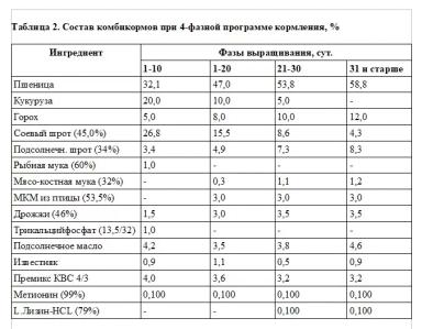 Ингредиенты, входящие в состав комбикорма при обоих вариантах кормления, были одинаковы: основу зернового рациона составляли пшеница собственного производства и кукуруза. Кроме того, в рацион были введены соевый шрот, премикс КВС, антиоксиданты и энзимный комплекс. В 4-фазной программе в комбикорме постепенно увеличивалось содержание более дешевой пшеницы (которую взрослые птицы усваивают лучше), подсолнечникового шрота, гороха и мясо-костной муки из птицы собственного производства, а содержание более дорогих кормов - кукурузы и соевого шрота – снижалось (табл. 1 и 2). Все основные показатели питательности рационов находились на сходном уровне и соответствовали нормам кормления цыплят кросса «Гибро-ПГ+», выведенного голландскими птицеводами.