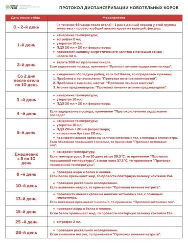 Четкое разделение по возрастным группам, физиологическому состоянию и нозологии. Клинические рекомендации при переводе на сухостой (например, одномоментный запуск интрацистернально), витаминизация глубокостельных, ведение отела (обработки рожениц и новорожденных), постотельный период (таблетки кальция, в/м введения окситоцина первые 5 дней, витаминизация, препараты железа), ректальный осмотр, профилактические мероприятия для новорожденных телят (обработка пупка, введение 9-валентной сыворотки, применение препаратов, предупреждающих диспепсию) и т.д. В случае возникновения осложнений нередко приходится корректировать протокол лечения в зависимости от тяжести и длительности, от глубины поражения органов и сопутствующих заболеваний.
