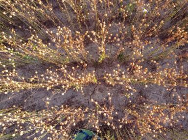 Особое внимание необходимо уделить подготовке к уборке. Должен быть исправный режущий аппарат, (лучше новый) хорошо отрегулированный как ход ножа так и зазоры. Можно убирать на прямую с десикацией, можно очесывающей жаткой, мы убирали путём подбора с волка. При уборке подбором, лён скашивают при созревании 75% коробочек.