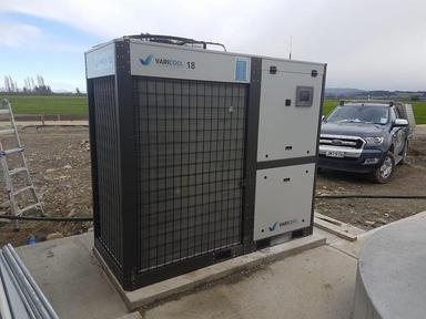 Ставиться емкость с водой и охлаждается до 5 градусов при этом также может нагревать воду для хоз нужд! 5 градусная вода вторым контуром идёт через радиатор охлаждение молока! Первым контуром можно использовать обычную воду 15-18 или артезианскую что намного ниже температурой!