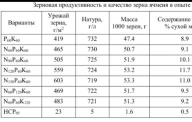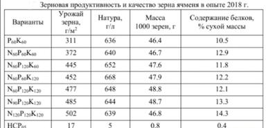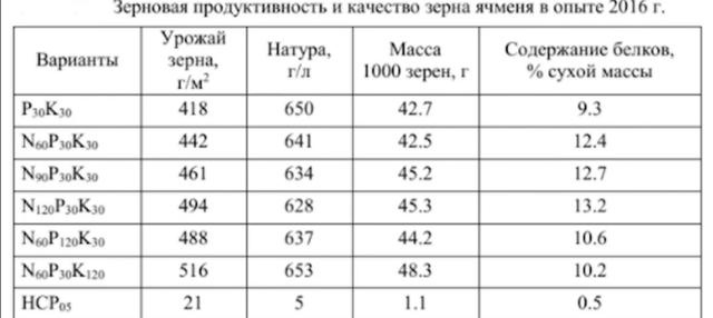 По листовым подкормкам - работаете в фазу кущения, а если осадков будет достаточно, то можно и в ф. налива семян сработать повторно - если будете работать с баковой смесью гербицид +микроэлементы, лучше использовать гуминовые или фульвокислоты (Гуминатрин). Если обработка только микроэлементами, то можно использовать аминокислоты в хелатной форме - особенно это актуально в условиях засухи. Что касается засушливых условий - здесь микроэлементы лучше не вносить в ф. налива зерна -т. к. с массой 1000 семян у вас возрастёт и содержание белка в зерне, что не будет соответствовать требованиям стандарта. Кроме этого, в университете закладывался опыт в 2018 г. по питанию в разных нормах. В этом году были высокие температуры и низкая обеспеченность влагой - лучший результат показал опыт с внесением NPK-60:120:60 кг/га. Также опыты закладывались в 2017 г, который был дождливым с высокой обеспеченностью влагой в почве в период вегетации ячменя - лучший результат с вариантом опыта NPK-150:60:60 кг/га. И в 2016 г., который был умеренно - влажным-лучший результат показал вариант NPK-60:120:30 и 60:30:120 кг/га. Результаты представлены в таблицах.
