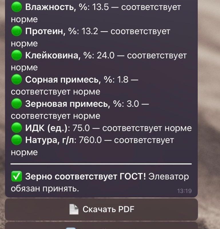 На скриншотах — реальная проверка пшеницы по ГОСТ 9353-2016. Все показатели в норме. Бот выдал PDF который можно предъявить прямо на элеваторе.