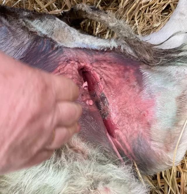 Согласно источнику, у стельной коровы в течение трех дней матка находилась в скрученном состоянии, за это время теленок погиб. Ветеринар провел кесарево сечение. Рассекли ткани, достали мертвого теленка, очистили матку и все зашили.