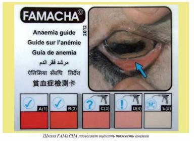 систему оценки степени анемии FAMACHA© (разработана в ЮАР, первоначально использовалась на овцах, но одобрена и на козах). Это ламинированная карточка с пятью различными оттенками, позволяющая оценить анемичность слизистой оболочки конъюнктивы, где красному цвету присваивается 1 балл, белому – 5 баллов (см. рисунки ниже).