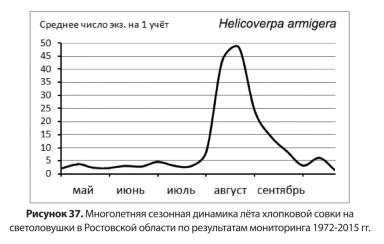 Не следует ожидать подъема численности хлопковой совки первого поколения при недостаточном обеспечении гусениц третьего поколения тепловым ресурсом, т.е. если сумма накопленных эффективных температур за вторую декаду августа - сентябрь будет ниже 300˚C.