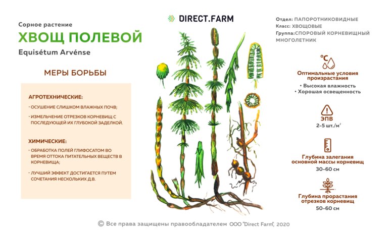 🔺 Чем меньше отрезки корневищ и чем глубже они заделаны в почву, тем слабее они отрастают. Поэтому, при обработке, одной из задач в борьбе с хвощем полевым должно быть измельчение отрезков корневищ с последующей глубокой их заделкой, что может быть достигнуто повторными обработками почвы.