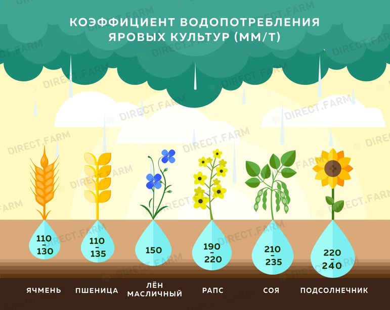 Ниже расположена инфографика, в которой указаны справочные данные по влагопотреблению основных культур (в миллиметрах воды на тонну продукции). Как Вы можете увидеть, наибольшее потребление воды у подсолнечника, наименьшее – у ячменя.