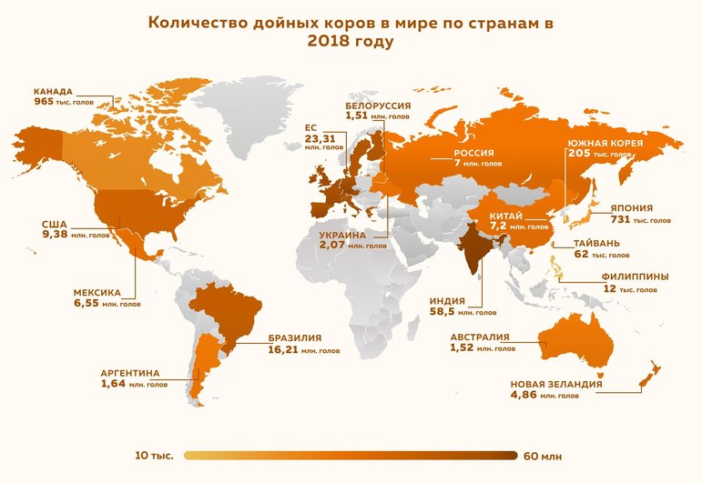 Россия находится на 6 строчке мировых лидеров по количеству дойных коров в 2018 году – 7 млн. голов.