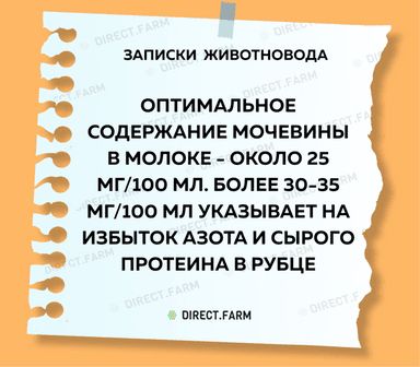 - Мочевина в молоке – это показатель для проверки обеспеченности микроорганизмов рубца азотом, основой сырого протеина. Содержание мочевины не ниже 15 мг/100 мл молока. Оптимально - около 25 мг/100 мл. Более 30-35 мг/100 мл указывает на избыток азота и сырого протеина в рубце.