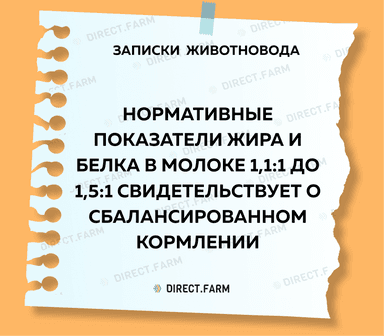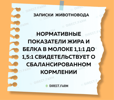 - Соотношение жира к белку. Нормативные показатели жира и белка в молоке 1,1:1 до 1,5:1 свидетельствует о сбалансированном кормлении. Соотношение жира к белку более чем 1,5, особенно в начале лактации (кроме молозивного периода) – это предупредительный сигнал. Следствием этого могут быть нарушения обмена веществ (кетоз).