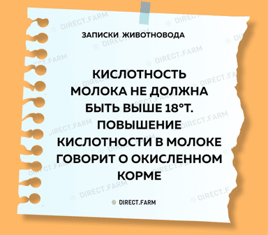 - Кислотность молока не должна быть выше 18°T. Повышение кислотности в молоке говорит о окисленном корме. Поэтому стоит проверить условия хранения и заготовки кормовой базы.