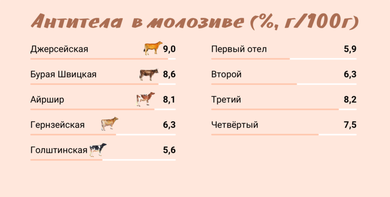 - Порода молочного скота: голштинские коровы имеют меньшую концентрацию антител в сравнении с коровами других пород, а джерсейские большую.