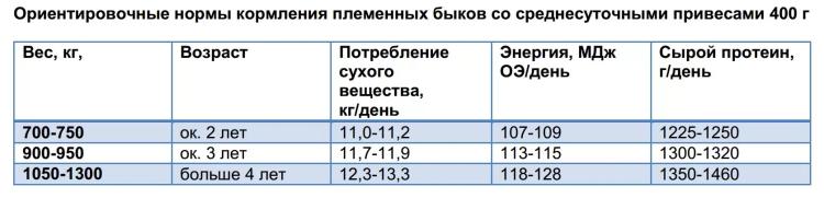 Ориентировочные нормы кормления племенных быков со среднесуточными привесами 400 г — во второй прикрепленной таблице.