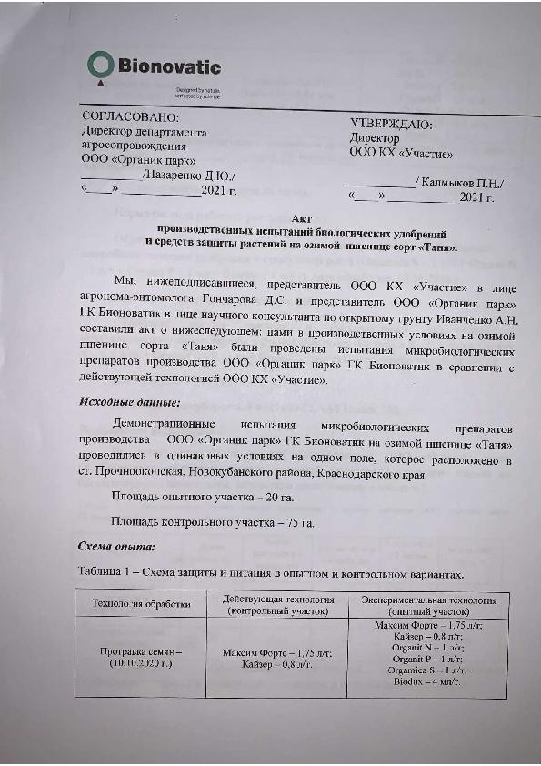 В условиях хозяйства “СПК Колхоз им. Мясникяна” Ростовской области на сорте озимой пшеницы «Морозко» были проведены испытания биопрепаратов от компании «Bionovatic»: