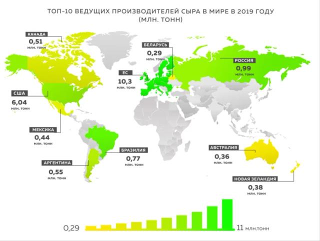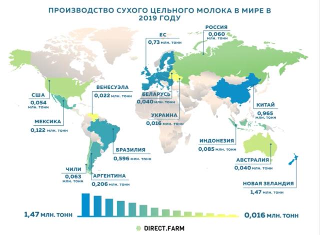 Евросоюз произвел 31% молока от общего мирового объёма производства. При этом 70% всего объема приходится на 5 лидирующих стран: Германию, Францию, Великобританию, Нидерланды и Италию. После ЕС топ- 3 страны являются: Соединённые штаты – 98,8 млн. тонн (19,5%), Индия 76 млн. тонн (15%), Россия – 31,45 млн. тонн (6%).