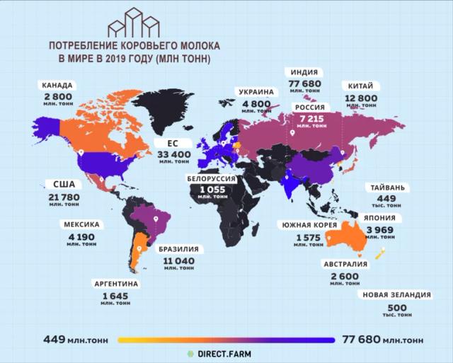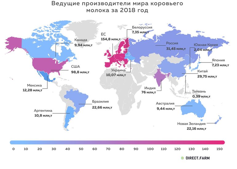 Производство молока во многих странах является основным источником доходов. По данным 2018 года, Евросоюз, в состав которого входит 28 стран, по показателям воспроизводства молока обошёл Соединённые Штаты на 56 млн. тонн.
