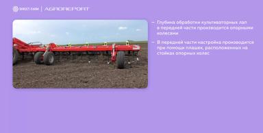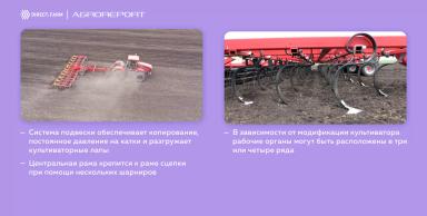 Культиватор обладает самоочищающимися рабочими органами и стойками, прочной конструкцией рамы и креплений, что позволяет поддерживать высокую скорость обработки даже на сильно засоренных участках. Расчетная производительность культиватора составляет 14 га/ч.