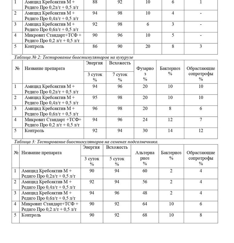 Испытываемые препараты: «Амицид Кребсактив М», «Микровит стандарт», «ТерраСорб Фолиар», «Редиго Про». («Редиго Про» зарегистрирован на горохе, но не имеет регистрации для применения на кукурузе и подсолнечнике. Учитывая, что основная цель, была проверка препарата на горохе, и то, что семена подсолнечника и кукурузы практически всегда продаются уже протравлены, то на них применили препараты аналогично гороху. Протравитель был использован с целью предотвращения негативного влияния семенной инфекции на гибель проростков.)