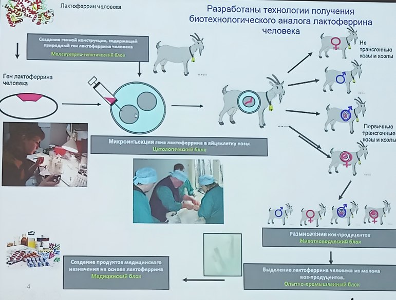 В период СССР особое внимание уделялось здоровью детей. Был разработан метод получения рекомбинатного человеческого лактоферрина (рчЛФ) с помощью генетически модифицированных коз. Эти достижения сохранились. В настоящее время еще возможно разводить трансгенных коз естественным путем но, к сожалению, работа с генетически модифицированными организмами ограничена из-за запрета.