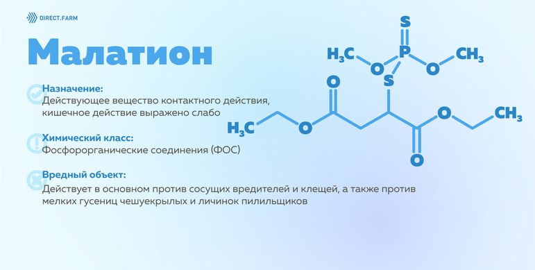 – Высокая токсичность малатиона обусловлена тем, что при попадании в организм насекомых-вредителей д.в. под воздействием окислителей превращается в более токсичный малаоксон, который обладает более высокой физиологической активностью.