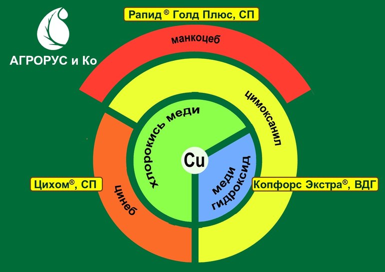 В настоящий момент аграрии применяют препараты меди на основе сульфатных форм, хлорокиси меди и гидроксид меди. Компания ООО «Агрорус и Ко» выпускает препараты на основе хлорокиси меди и гидроокиси меди. Данные формы по сравнению с сульфатами меди более эффективны при борьбе с микроорганизмами, обладают меньшей фитотоксичностью для растений и обладают меньшей коррозийной агрессивностью к опрыскивателям. А за счет добавления дополнительных действующих веществ, компании удалось не только повысить эффективность компонентов меди, но и дополнительно снизить их фитотоксичность. На данный момент ООО «Агрорус и Ко» предлагает своим клиентам 3 препарата с медным компонентом: Рапид Голд Плюс, Цихом и Копформ Экстра.
