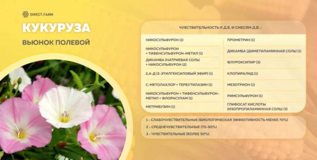 🔹Высокую эффективность по вьюнку имеет д.в. дикамба, но не менее 150 г/га по д.в. Его можно применять в зерновых колосовых, на просе и кукурузе.
