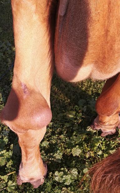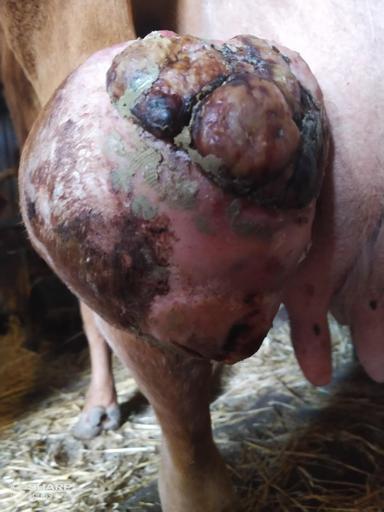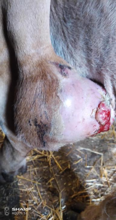Мы получили фото от фермера с подробным описанием проблемы: физиологический статус-сухостой. На ощупь воспаление нетвердое, что-то наподобие абсцесса, на всей площади одинаковой консистенции, местная температура не повышена, не болезненное при пальпации. Животное немного прихрамывает на сторону, где отёк. Прогрессировал в течение 3-3,5 недель. Пункцию не делали.