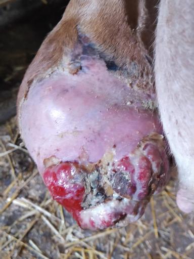 🔻Травма (ушиб) — обычно от доильного оборудования, станка для фиксации, станка для обрезки копыт (при сильном поднятии тазовой конечности).