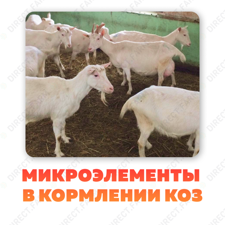 Важные микроэлементы в кормлении коз: йод, железо, цинк, кобальт, селен, молибден, медь, марганец.